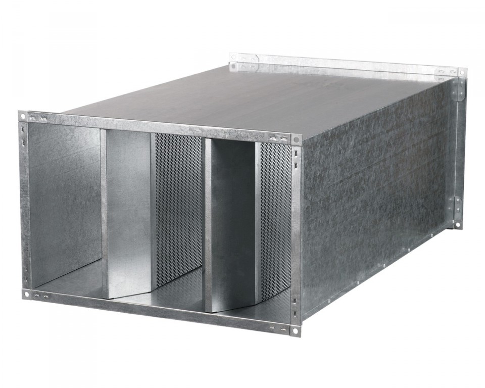 Корпус шумоглушителя и оболочки пластин изготовлены из оцинкованной стали. Пластины наполнены негорючим звукопоглощающим материалом с защитным покрытием, предотвращающим выдувание волокон.