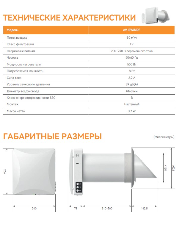 Настенное и лёгкое исполнение — быстрая установка без сложных воздуховодов.