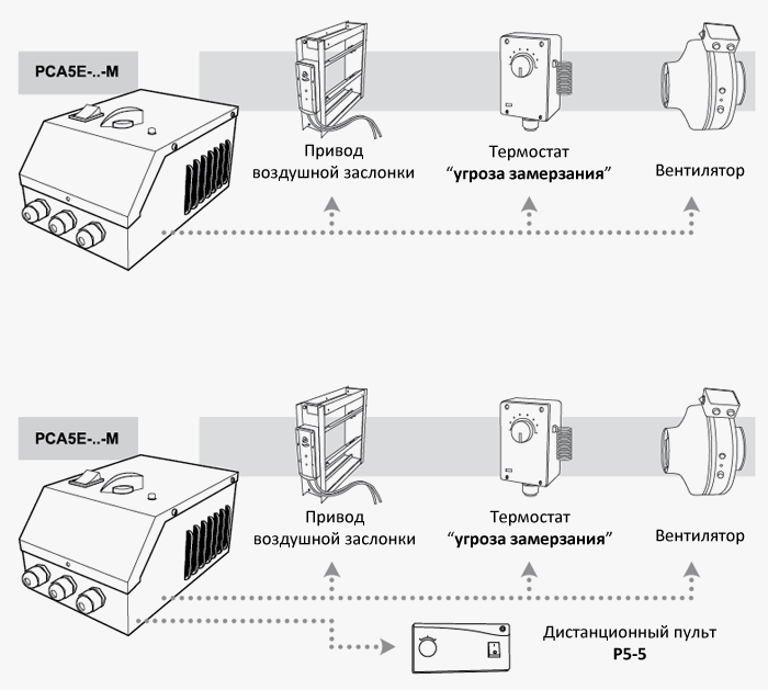 - клеммы для подключения к комнатному термостату или к термостату защиты от обмерзания. При разрыве цепи прекращается подача напряжения на двигатель вентилятора.