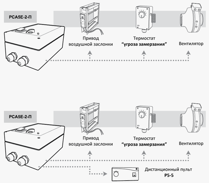 - клеммы для подключения к комнатному термостату или к термостату защиты от обмерзания. При разрыве цепи прекращается подача напряжения на двигатель вентилятора.